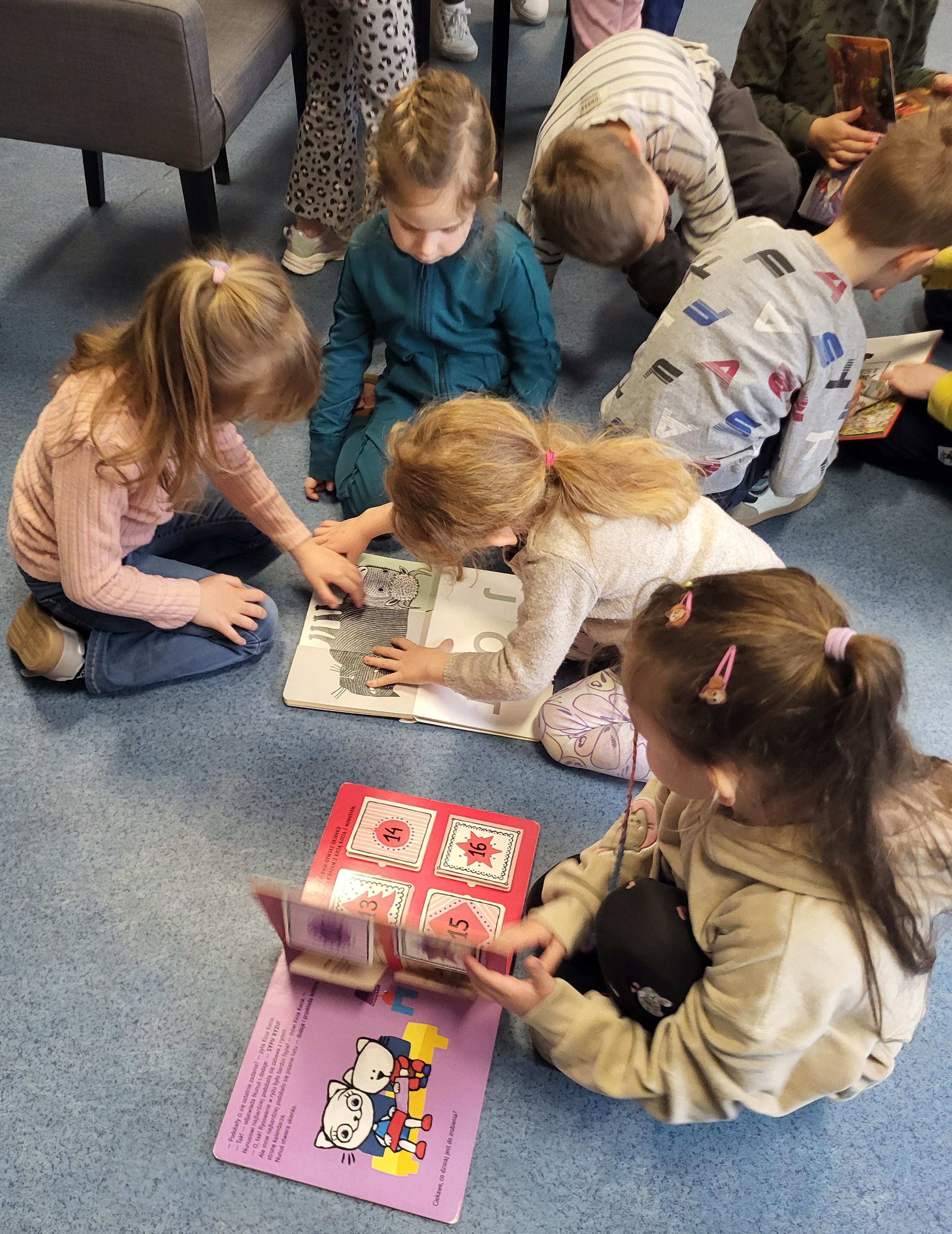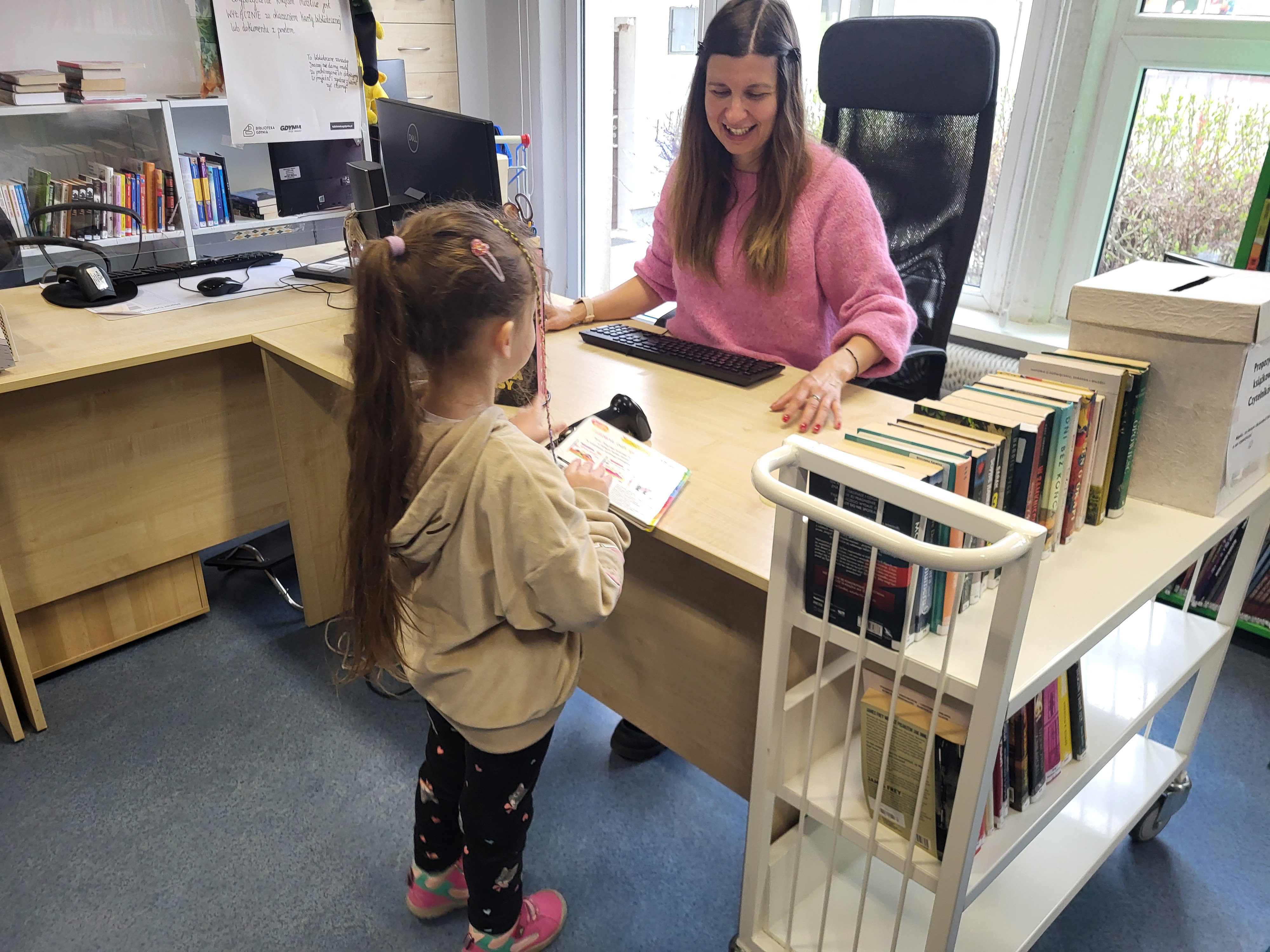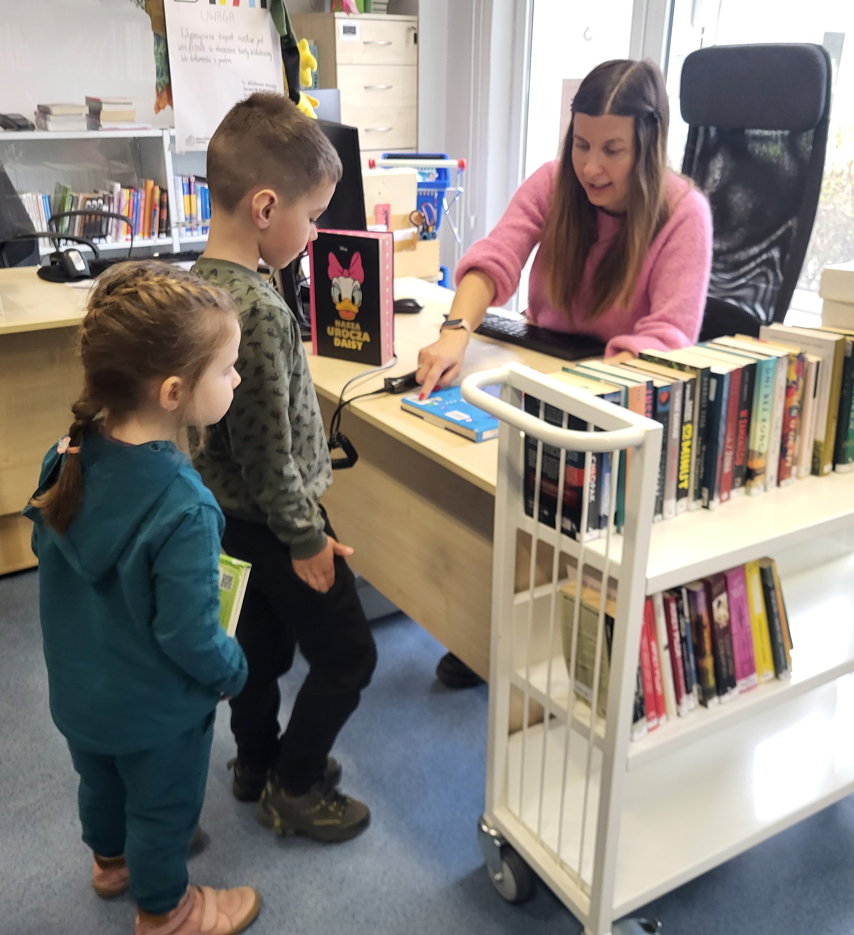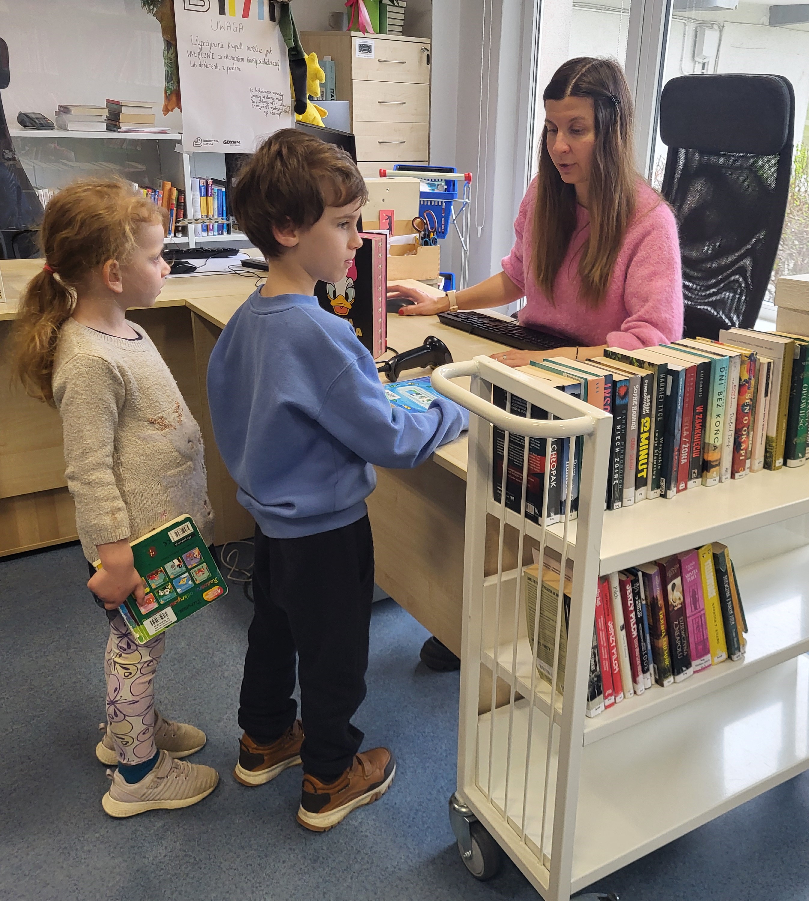 Dziś Świetliki odwiedziły bibliotekę publiczną obok naszego przedszkola. Celem wizyty było rozwijanie zainteresowań czytelniczych wśród dzieci. Przywitała nas pani bibliotekarka. Najpierw przedszkolaki wysłuchały bajki, a następnie poszukiwały kart bibliotecznych. Potem, Świetliki zapoznały się ze sposobem wypożyczania książek. Bawiły się również w bibliotekarzy, samodzielnie skanując poszczególne egzemplarze książek. Dzieci zostały oprowadzone po bibliotece i z wielkim zainteresowaniem oglądały książki znajdujące się na półkach. Szczególnie zainteresował ich dział dla najmłodszych. Na koniec wszystkie dzieci gorąco podziękowały pani bibliotekarce wręczając jej pamiątkowy dyplom oraz własnoręcznie przygotowane rysunki.