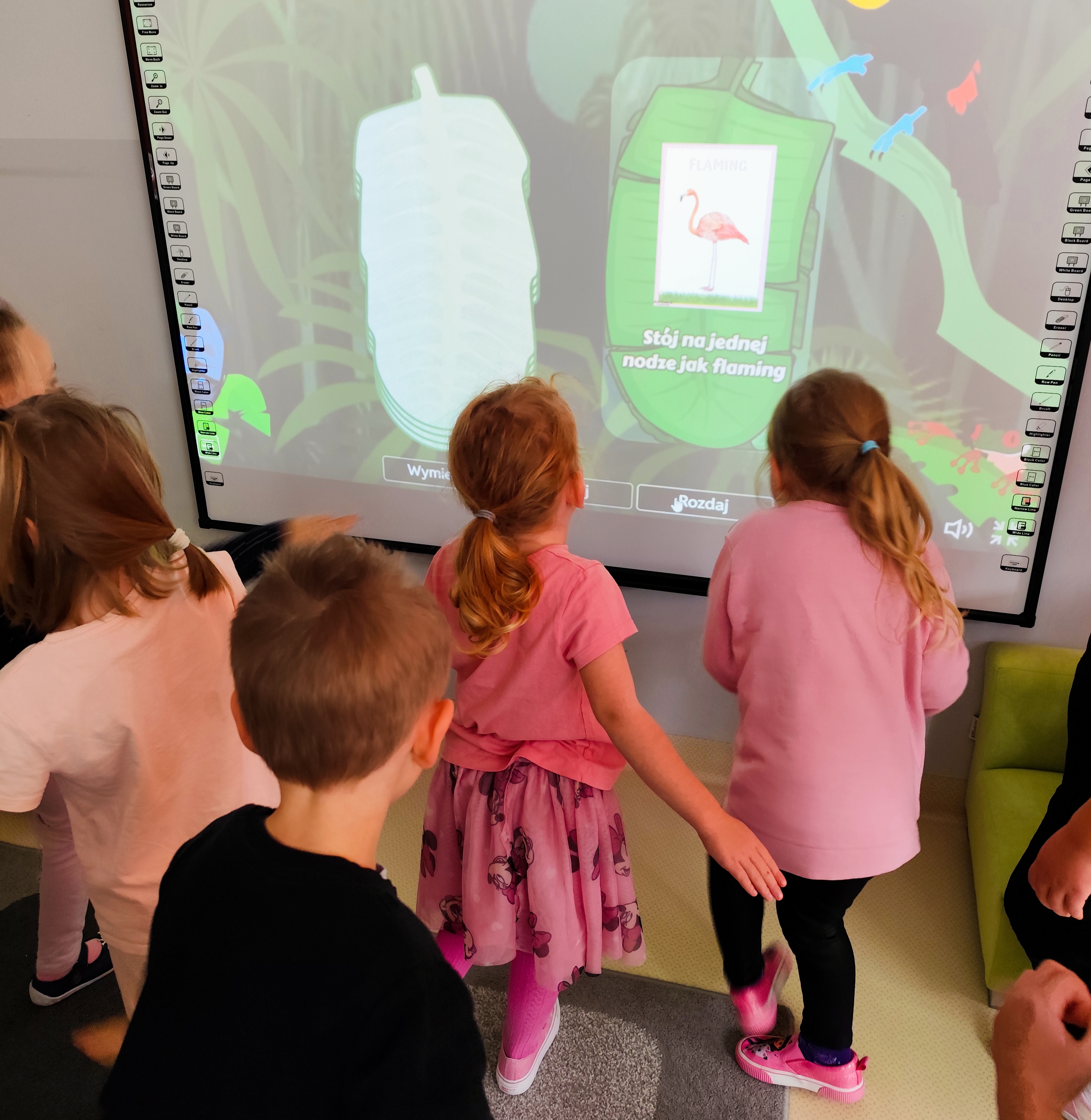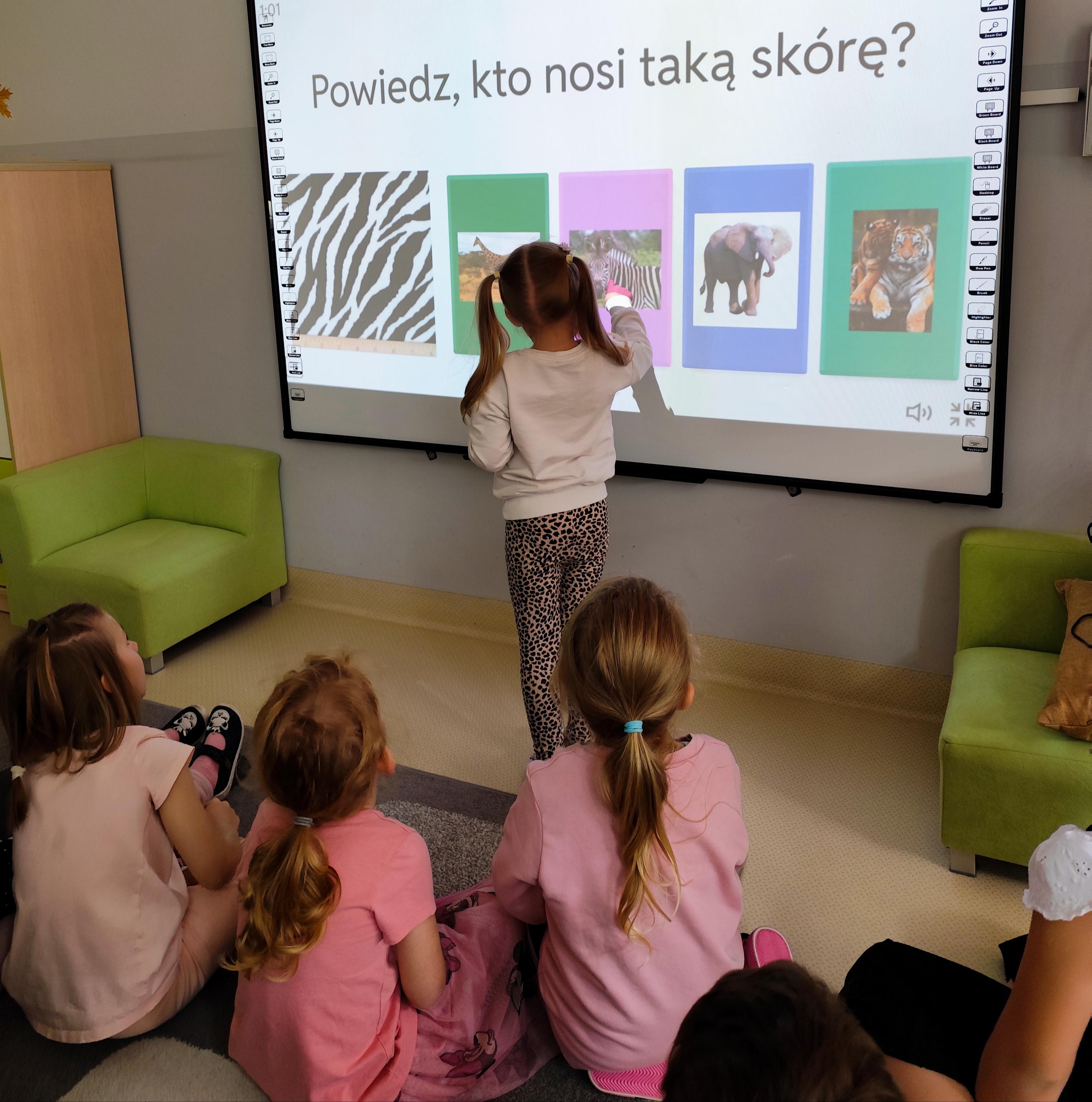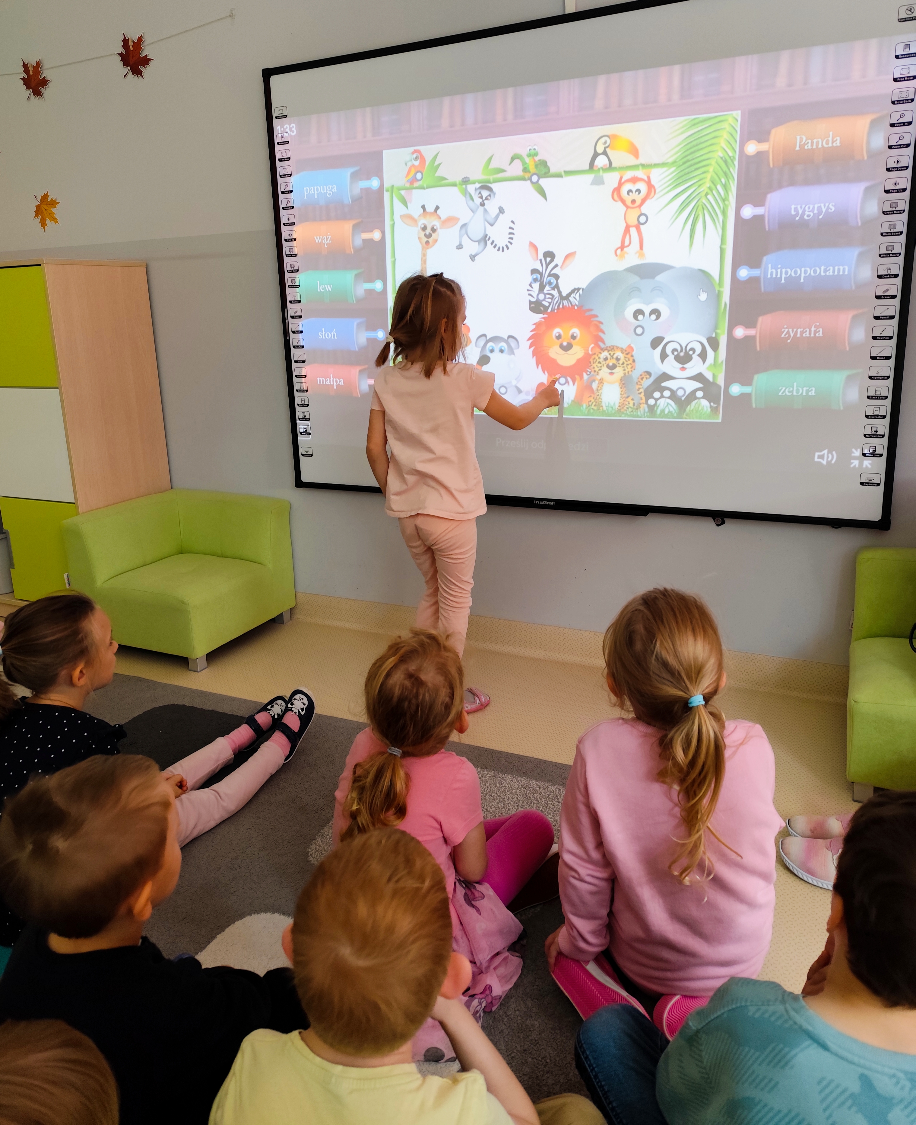 Świetliki dziś na zajęciach korzystały z tablicy multimedialnej. Dzieci grały w memory, dopasowywały zwierzęta egzotyczne a także ćwiczyły dużą motorykę naśladując zwierzątka. Radości było co niemiara.