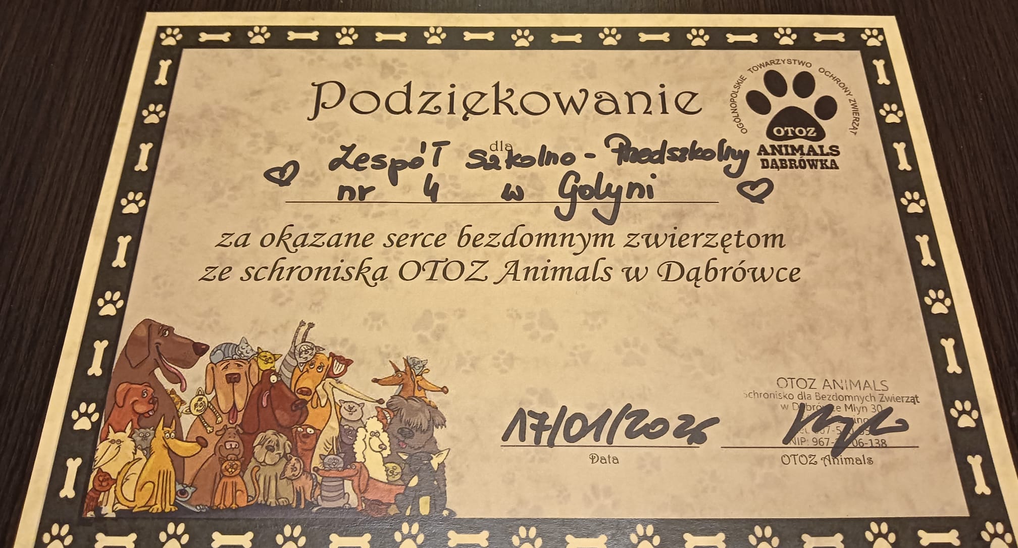" Z radością i wzruszeniem ogłaszamy zakończenie zbiórki darów dla naszych czworonożnych przyjaciół ze schroniska w Dąbrówce oraz Gdyńskiego "Ciapkowa"?Dzięki Waszemu zaangażowaniu udało nam się zebrać pokaźną ilość karmy, ciepłych koców oraz akcesoriów, które pomogą zwierzakom przetrwać ten trudny czas. Dziękujemy nauczyciele świetlicy